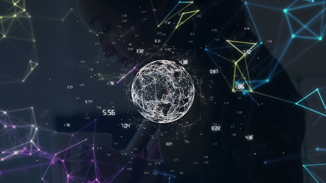 Abstract digital globe surrounded by network of connections and numerical data visualizations, representing interconnectedness and communication in technology-driven world. Ideal for presentations involving global network themes, connectivity in digital folders, technological innovation discussions, or data analytics visual concepts.