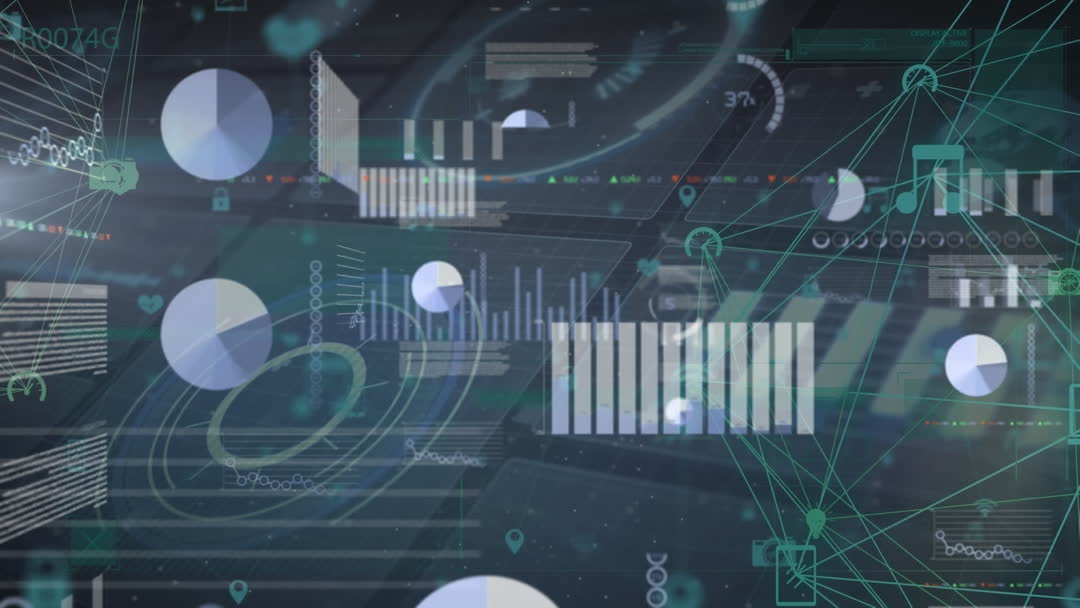 Digital visual representation shows a network of icons juxtaposed against fluctuating stock market data. Dynamic animation concept encapsulates financial analytics and global technology networks. Ideal for use in business presentations, financial services, trading websites, and technology seminars. Effective for illustrating data-driven decision making and market trends. Creates an engaging backdrop for technology workshops or economic summits.