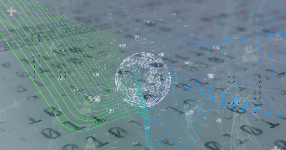 Illustrates concept of global networks and data processing. Useful for representing technology, internet infrastructure, financial analytics, or digital transformation in business settings.