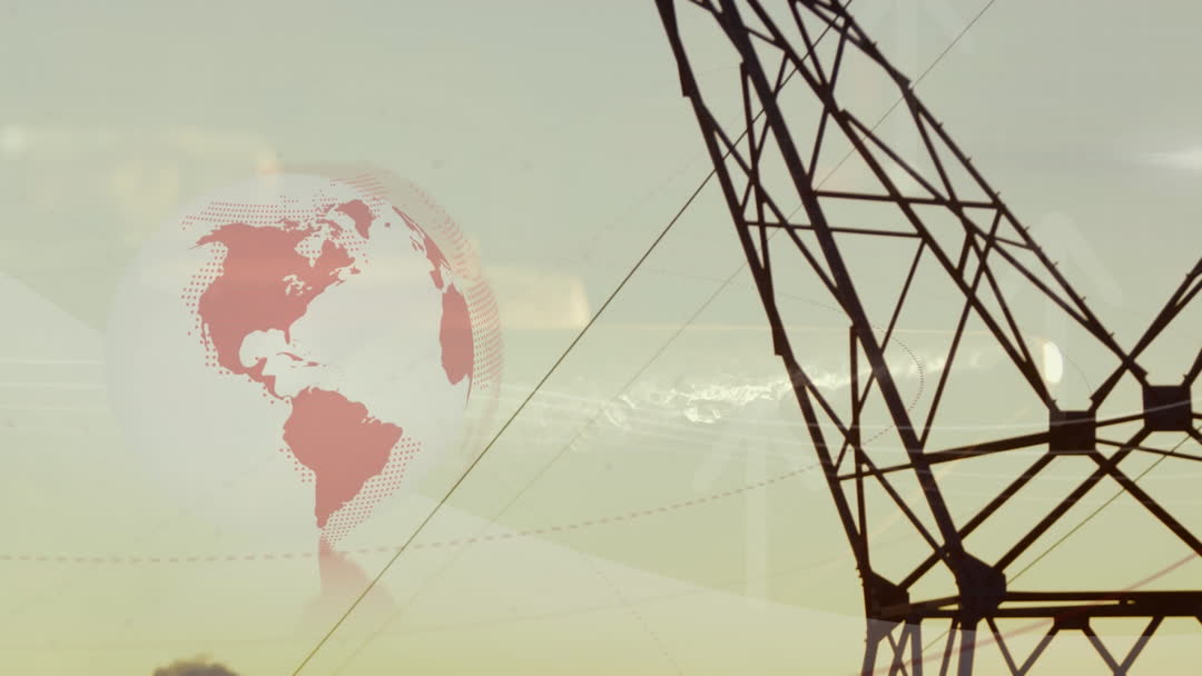 Animation showing a digital globe with superimposed power pylons signifies global connectivity and advanced technology. Perfect for illustrating technology concepts, global finance discussions, or modern infrastructure development projects. Provides a visual representation of global networks and innovation.