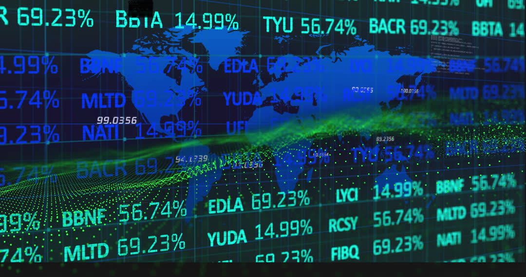 Visualization depicts a digital interface with data streaming over a world map and animated globe. Useful for illustrating topics related to global business, digital technology, or data analytics in presentations, reports, or educational materials.