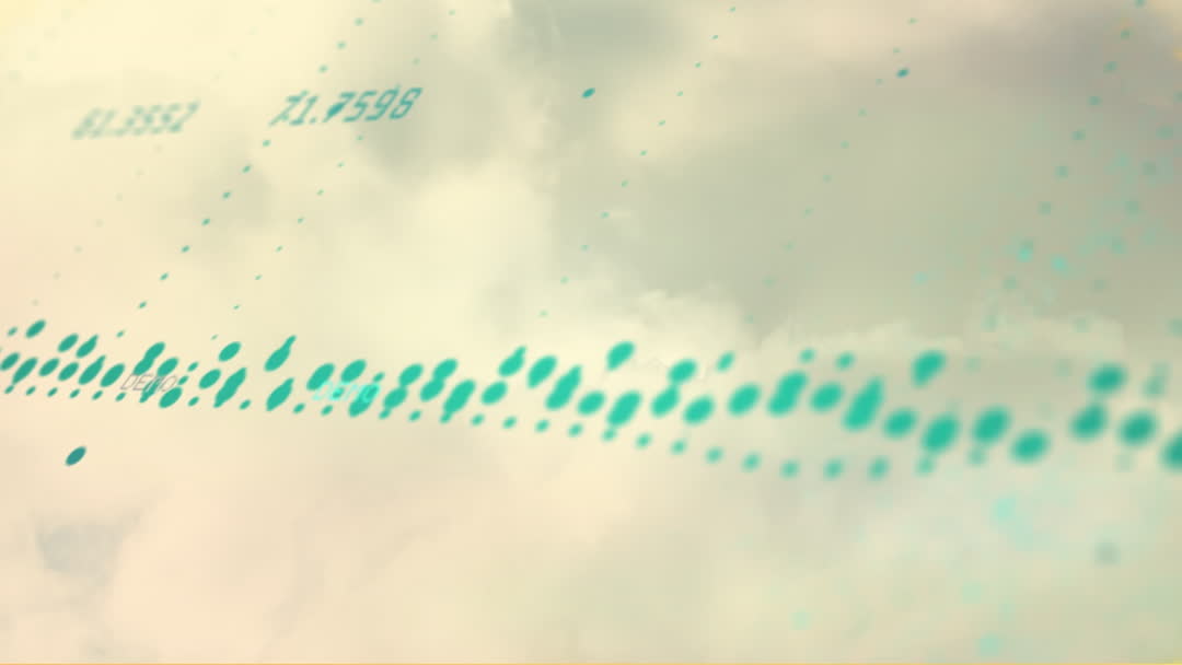 Visual representation featuring a series of blue digital dots and numeric data fading into a cloudy sky backdrop calls attention to a technological fusion with nature. Ideal for use in presentations focused on digital futures, technology integration, environmental tech visuals, and data interpretation narratives.