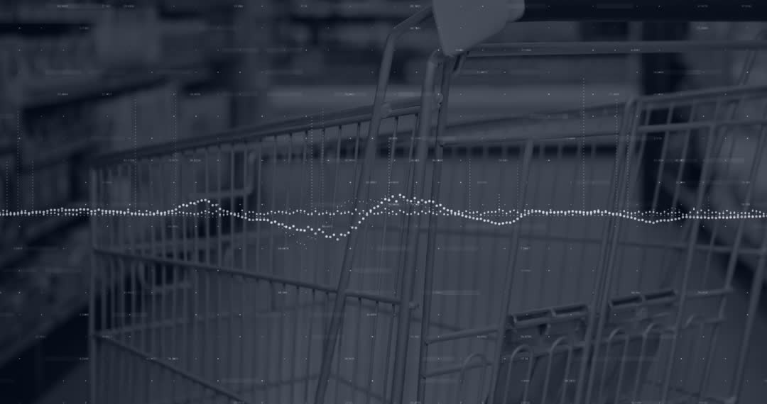 Image depicts data and digital graph over-imposed on shopping cart, hinting at retail analytics. Suitable for topics on technology in retail, digital commerce advancements, market data analysis, and smart shopping systems.