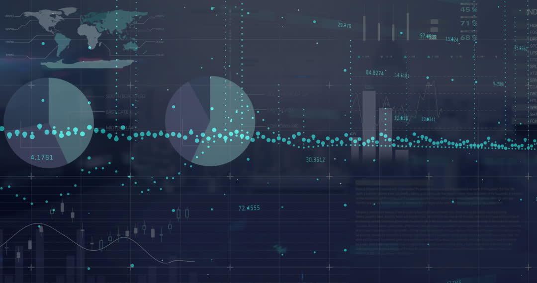 Digital illustration showing a dynamic graph with blue dots representing fluctuations in the global stock market. Background includes floating numbers and digital map elements, symbolizing global economic connections and data analytics. Suitable for use in financial reports, business presentations, and technology-focused marketing materials.