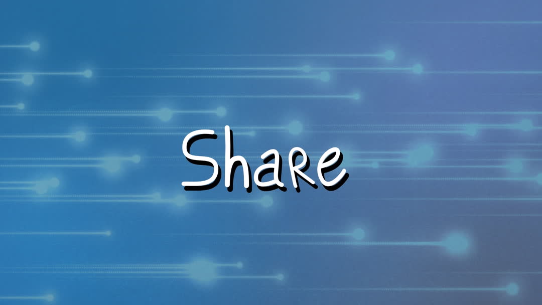 Dynamic animation displaying 'Share' over a futuristic blue tech background, showcasing interconnected data points. Ideal for illustrating concepts of social media engagement, technology communications, or sharing in presentations and digital content.