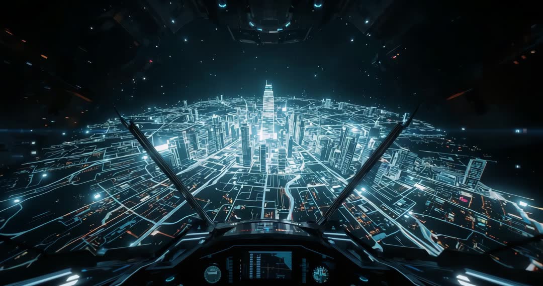 AI Generated Video. Scene depicts a futuristic spacecraft cockpit view as it approaches a digital wireframe representation of a city at night, with an assortment of advanced technology visible on control panels. Use for projects on digital design, urban development forecasting, virtual reality experiences, or space-themed storytelling.