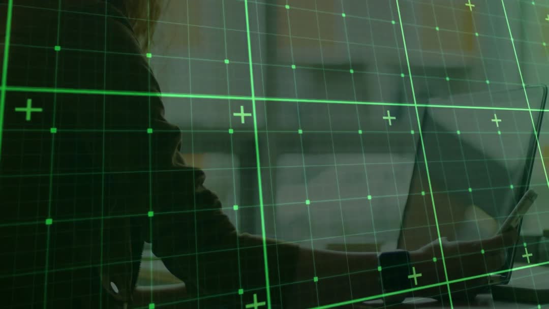 Footage focuses on digital grid overlay scanning office worker engaged with laptop. Modern workspace portrayal emphasizes integration of technology with daily routines through innovative and futuristic systems aimed at enhancing productivity. Suitable for editing tutorials, tech industry visuals, or educational content explorers utilization of contemporary digital solutions.