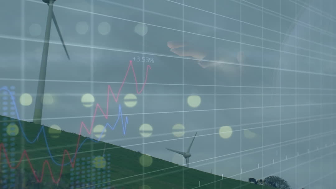 This animation features wind turbines combined with dynamic columns, visually representing both renewable energy and digital data processing. The presence of scientific charts and graphs suggests themes of market analysis, financial growth, and sustainable technology. Ideal for use in presentations on global business, journalistic pieces about infrastructure investments, or educational materials focusing on the intersection of technology and sustainability.