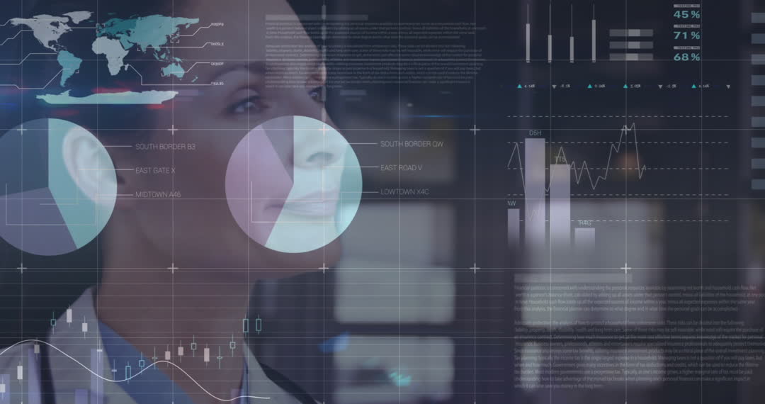 Doctor's profile incorporated with futuristic digital elements showcasing health data analytics and financial graphs. Ideal for illustrating topics on healthcare innovation, medical technologies, or the intersection of finance and healthcare industry. Useful for presentations, educational content, and discussing technologies in medicine.