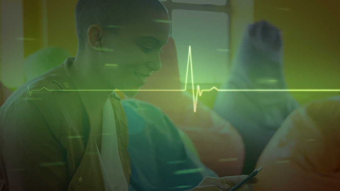 This composition shows a woman engaging with her smartphone, symbolizing the intersection of technology and healthcare. The superimposed heartbeat line and digital effects emphasize innovation in global health technology. Useful for campaigns or presentations focused on modern healthcare, telehealth innovations, or wellness app marketing.