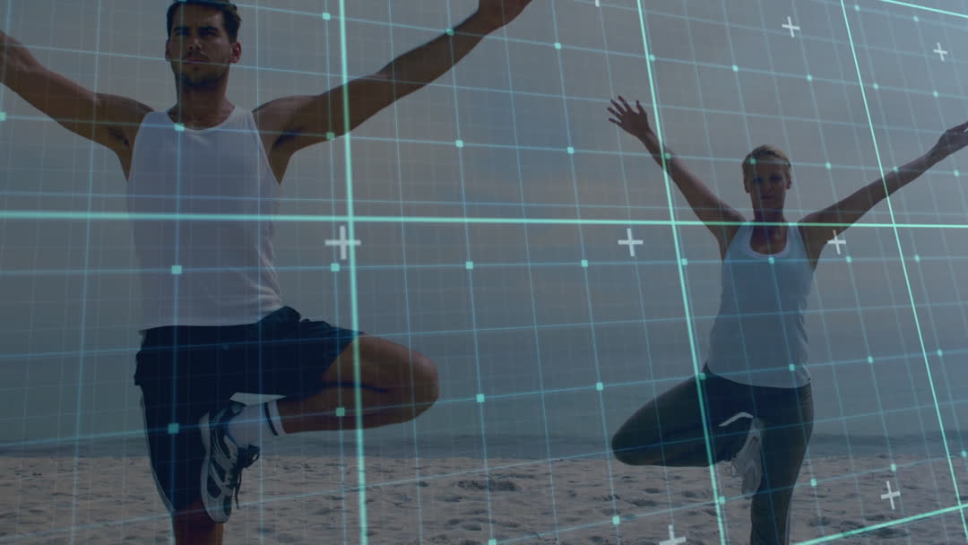 Dynamic composition of a couple practicing yoga on a beach augmented with a digital grid overlay signaling data processing concepts. This visual highlights the intersection of health and technology, making it ideal for illustrating topics like fitness tracking, wearable tech, and digital health solutions.