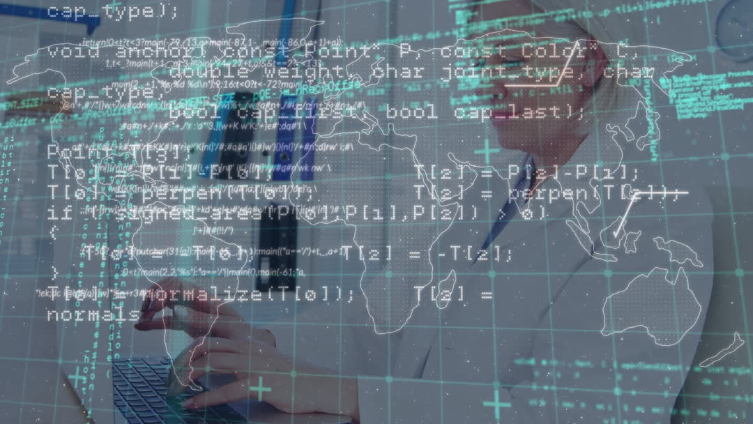 Doctor using laptop while code and world map overlay suggest themes of digital health and global connectivity. Ideal for illustrating innovations in telemedicine, international healthcare collaborations, and technology-driven medical solutions.
