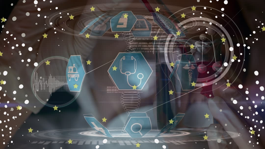 Animated digital interface illustrating global health innovation with collaborative connections. Concepts like digital healthcare and biomechanics predominate, ideal for health technology presentations, scientific initiative promotions, and educational templates focused on globalization's role in health advancements.