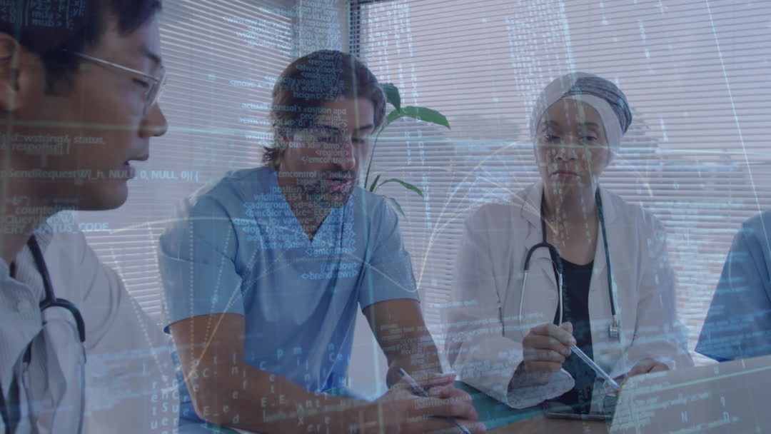 Medical professionals in a collaborative meeting with overlaid data visuals indicating technological advancements. Concept for digital healthcare innovation and integrating data technology in medical practices. Useful for topics on healthcare developments, tech insights in medicine, and teamwork in hospitals.