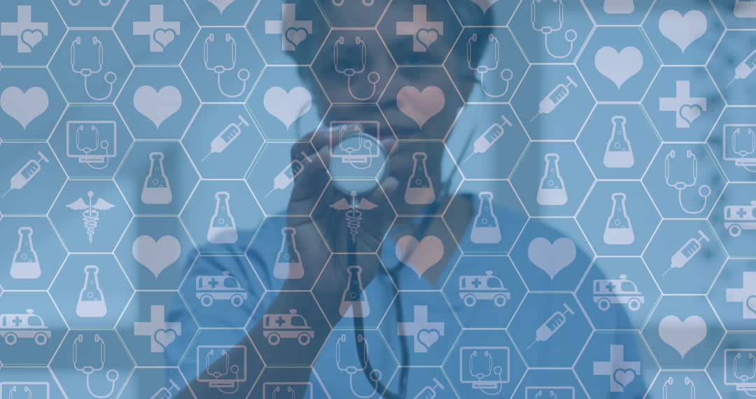 Image showcases an array of medical icons such as stethoscopes, hearts, and ambulances layered over a blurry silhouette of a healthcare professional. Ideal for themes related to modern healthcare technology, digital interfaces in medical industry, and innovative global health solutions.