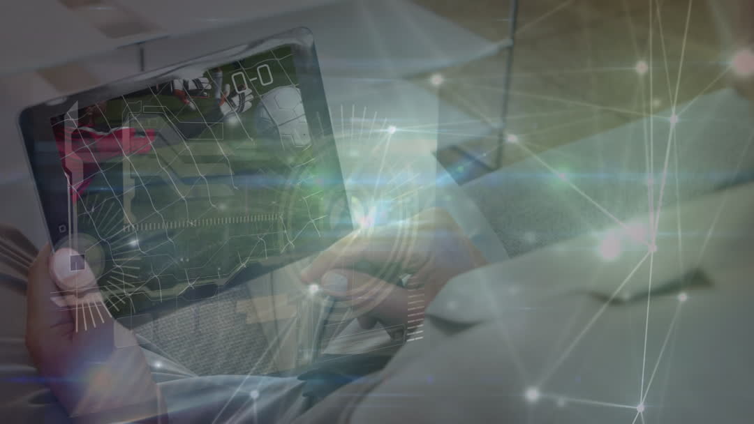 Healthcare professional exploring advanced digital interface on tablet, featuring overlaid network connections, reflecting innovation in medical technology. Ideal for illustrating themes of modern medicine, technological advancements in healthcare, or high-tech medical environments.