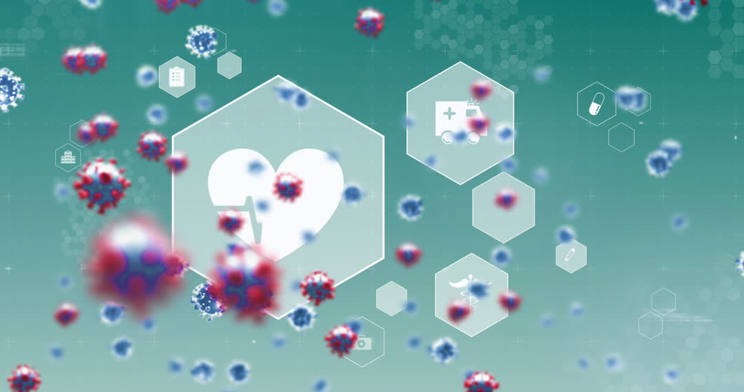 Illustration shows digital network of healthcare-related icons with floating virus particles on a gradient background in healthcare tech scene. Use in articles about healthcare technology advancements during the COVID-19 pandemic, medical research developments, or digital health transformations. Effective for visualizing concepts in professional healthcare presentations or educational materials about pandemic impacts in digital solutions. Suitable for global healthcare narrative or conveying innovation in health-related publications.