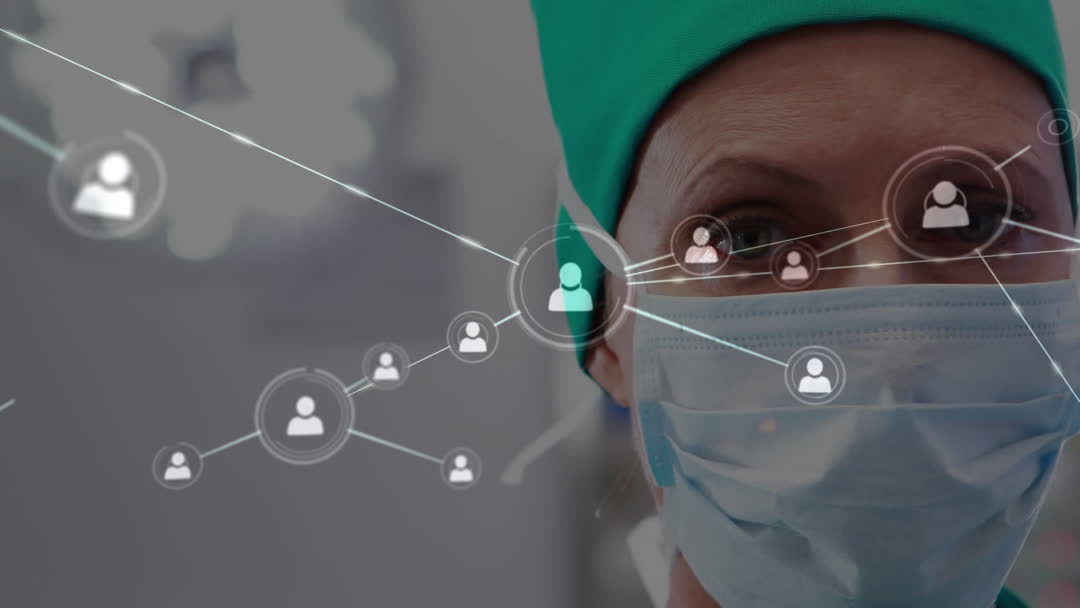 Visual illustrates a medical professional wearing a mask and cap, represented within a digital network. Lines and nodes signify global connections within the healthcare network. Suitable for content related to digital healthcare, telemedicine, medical innovations, and modern health solutions.