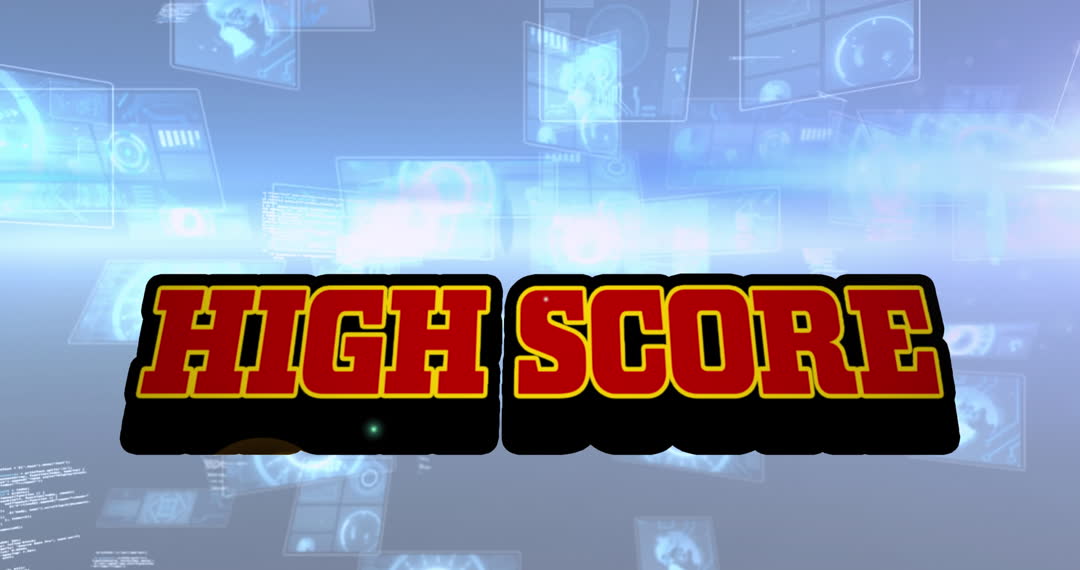 The visual portrays the animated text 'High Score' against a background featuring scope scanning and data processing elements. Suitable for illustrating concepts in gaming, digital analytics, or futuristic tech interfaces. Use in presentations, videos, and articles about digital innovation and social media data trends.