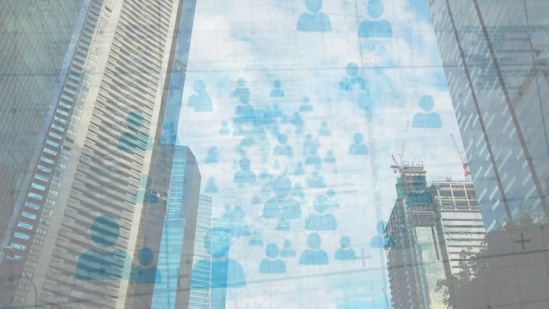 Digital hologram featuring person icons overlaid on a modern city skyscraper scene conveys themes of digital transformation and global business connectedness. Ideal for use in presentations highlighting urban tech advancements, connectivity in metropolis locations, or futuristic smart city concepts.