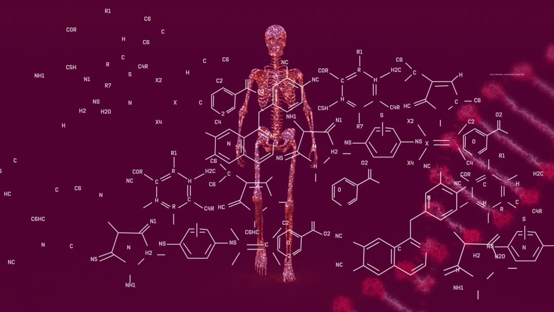 Futuristic illustration of human skeletal model intertwined with chemical structures against a textured burgundy palette. Ideal for educational content in fields such as chemistry, biology, or anatomy. Enhances science textbooks, digital learning modules, or online lectures focusing on the human body and molecular structures.