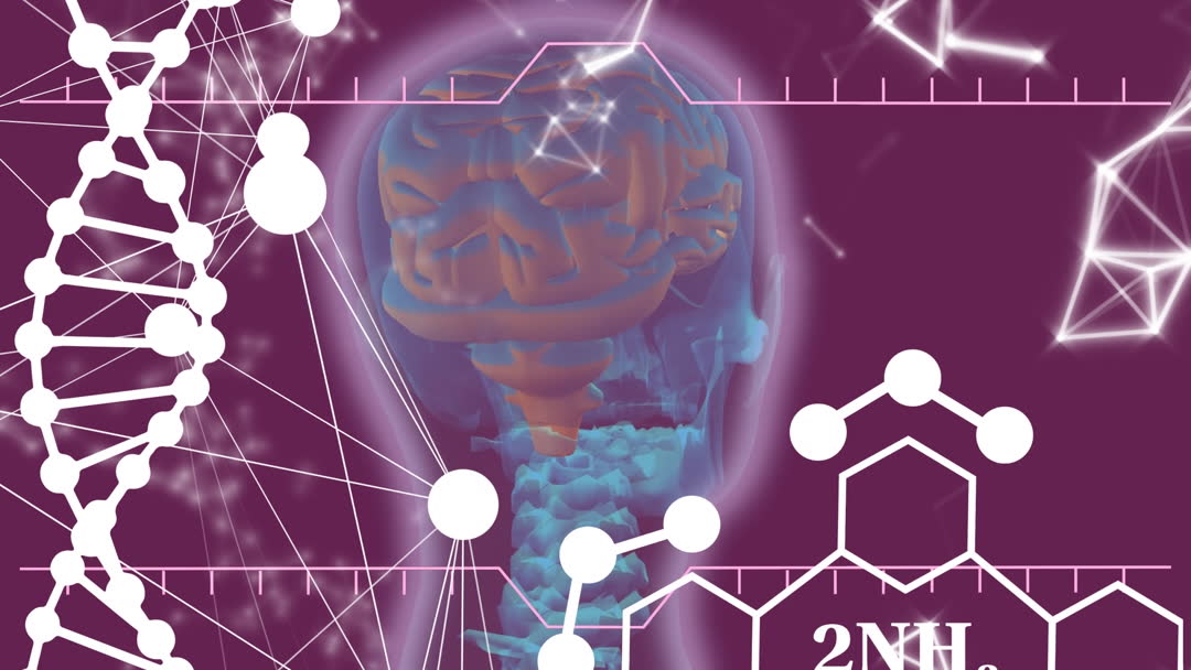 Digital illustration features human head model with prominent DNA strands and neural connections on a purple background. Elements represent science, anatomy, and the interplay of genetics and brain function. Suitable for educational materials on biology, medicine, and technology. Ideal for representing scientific research or futuristic medical intelligence.