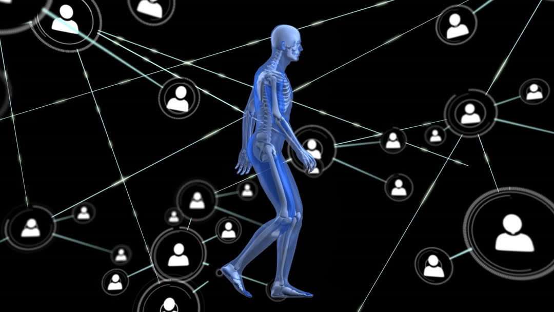 This visualization depicts a blue digital model of a human skeleton intertwined with a dynamic network of connections and profile icons on a dark background. Useful for illustrating concepts in digital biology, healthcare technology, data networks, and human-centric connectivity in scientific presentations, educational content, or health-related infographics.