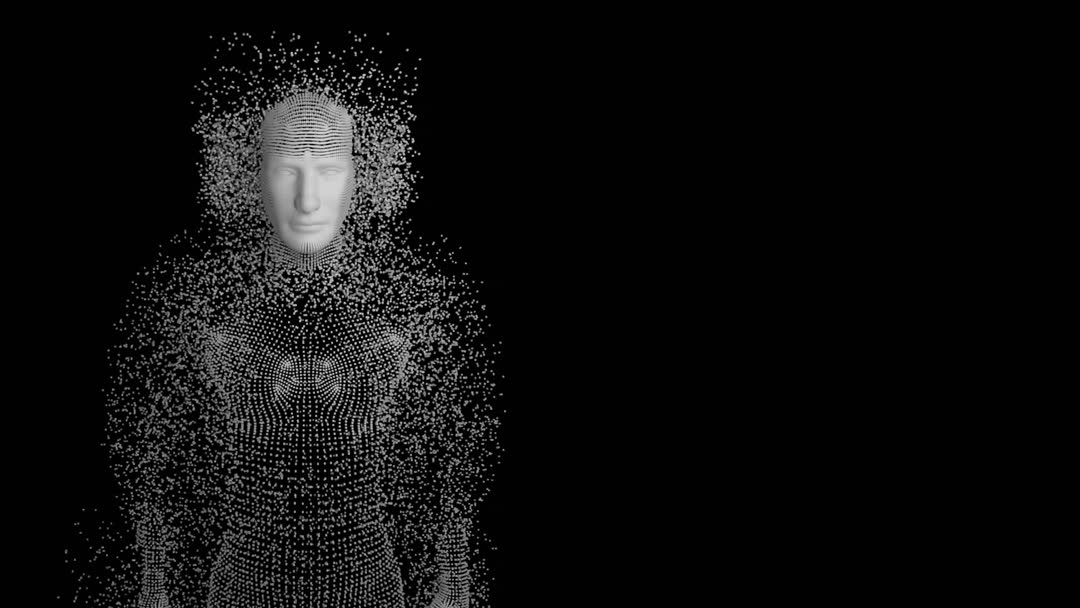 Abstract digital illustration shows formation of human figure using scattered small particles. Used for technology presentations, futuristic designs, and concepts involving artificial intelligence or digital transformation. Can also illustrate virtual identity and data visualization.
