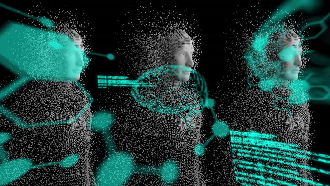 Digital representation of human models interacting with data streams, showcasing innovation in technology and scientific research. Ideal for marketing campaigns, technology content, educational materials on human biomechanical aspects, and digital animations related to data processing.