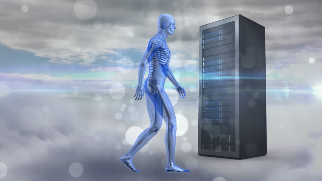 Visualization depicting digital transformation where a human skeleton integrates with server technology, suggesting advancement in digital interfaces. Suitable for illustrating technological progress in medicine and computing, or exploring themes in AI and data security.