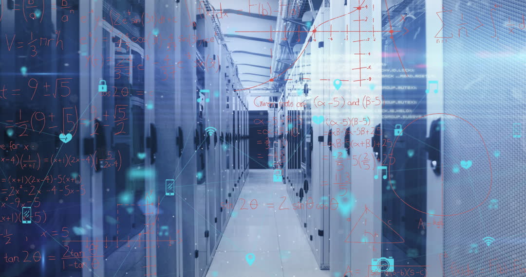 Visual depicting digital icons and mathematical graphs appearing over a server room with extensive server racks. It highlights themes of data processing, technological innovation, and information networking. This video is ideal for illustrating concepts in tech blogs, online platforms related to AI development, and articles on data center operations.