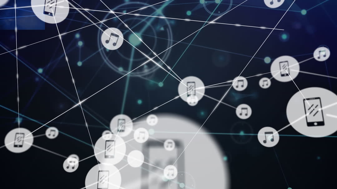 Illustrates expansive networking with interconnected digital icons and light trails on a blue background. Icons depict music notes and mobile devices, symbolizing the integration of technology and communication. Useful in presentations or advertisements focused on digital connectivity, tech industry advancements, or global communication themes. Could also enhance tech-focused articles or blogs discussing the evolution and impact of modern digital networks.