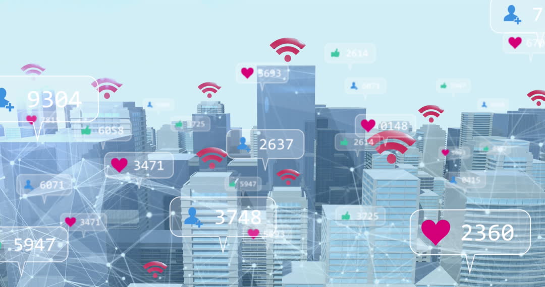 Digital overlay of social media and wi-fi icons connects over skyline, symbolizing modern connectivity and digital communication. Useful for illustrating themes in tech, urban lifestyle, or digital leaving. Ideal for presentations and articles on smart cities and digital business strategies.