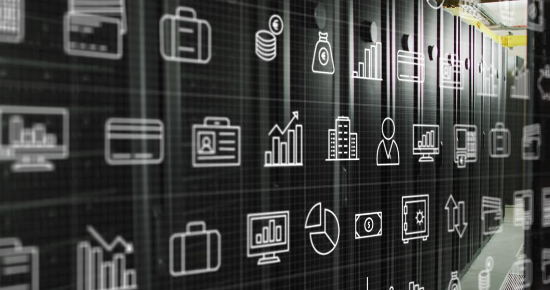 Several digital icons overlaid on data server racks in a modern data center convey themes of technology, business analytics, network security, and finance. Each icon symbolizes elements like analytics, banking, and networking, representing the multidimensional aspect of digital data solutions. Useful for illustrating themes in digital transformation, infrastructure management, or a futuristic technology environment.