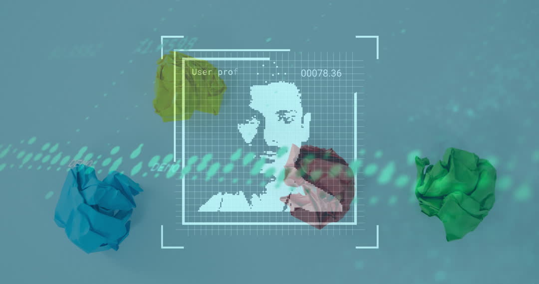 Scene depicting digital user profile interface overlapping crumpled colored papers, symbolizing challenge and complexity of data security. Useful for illustrating topics on cybersecurity, identity verification, or social media analysis in digital and creative projects.