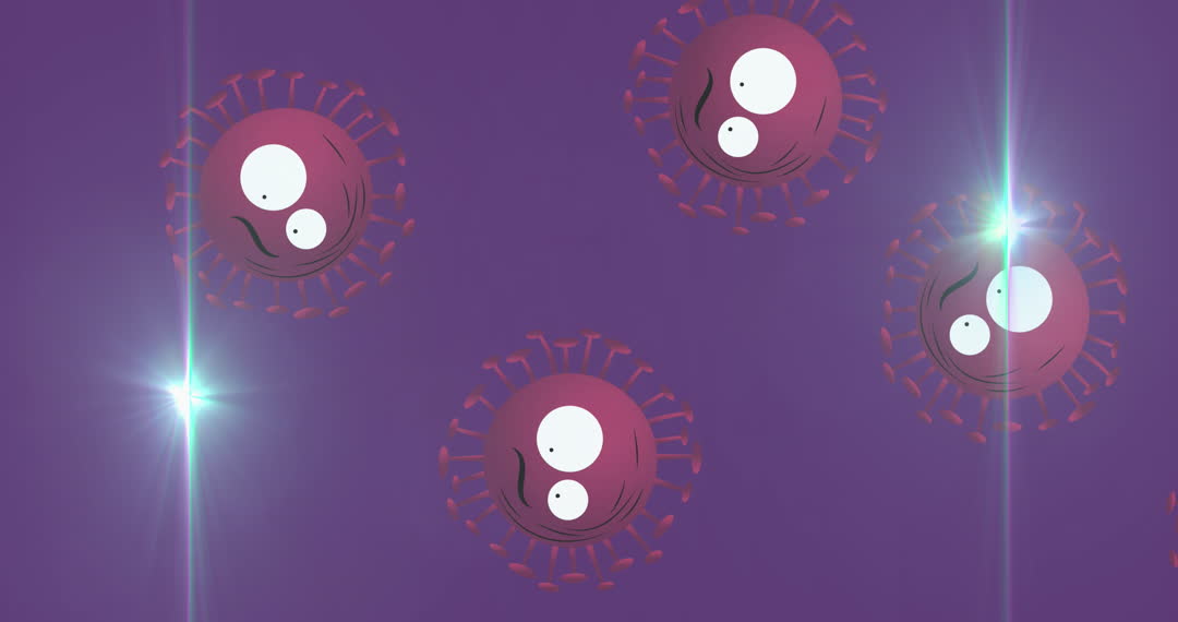 Illustration features stylized virus cells with light effects against a purple background, perfect for educational materials on health and safety. It can be used for articles about pandemics, healthcare animations, or conceptual designs relating to viruses.