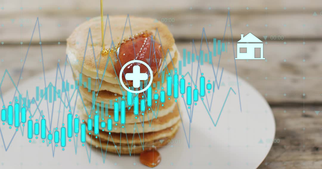 This video frame presents a creative blend of rustic and digital aesthetics, featuring a stack of pancakes being drizzled with syrup. An overlay of digital charts and icons serves to represent different sectors such as hospitality, integrating traditional food videory with modern data visualization concepts. It is suitable for use in articles or presentations about the intersection of technology and the food industry, potentially addressing topics related to economic analytics, sector growth, or developments in digital interactivity for restaurant services.