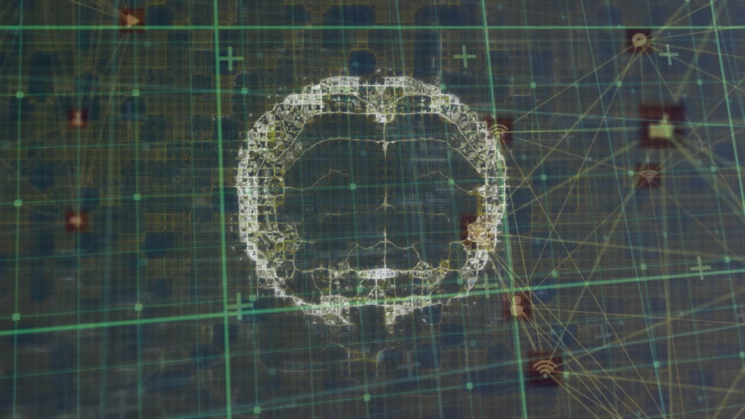 Futuristic animation depicting digital icons and a representation of the human brain interacting on a technological grid. Ideal for illustrating themes of advanced technology, innovation, and the intersection of global networking with medical research. Suitable for use in presentations, educational materials, and articles focusing on cutting-edge scientific or technological developments.
