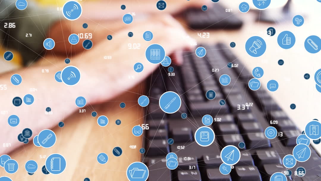 - Digital Innovation Icons Overlay Typing Hands on Keyboard