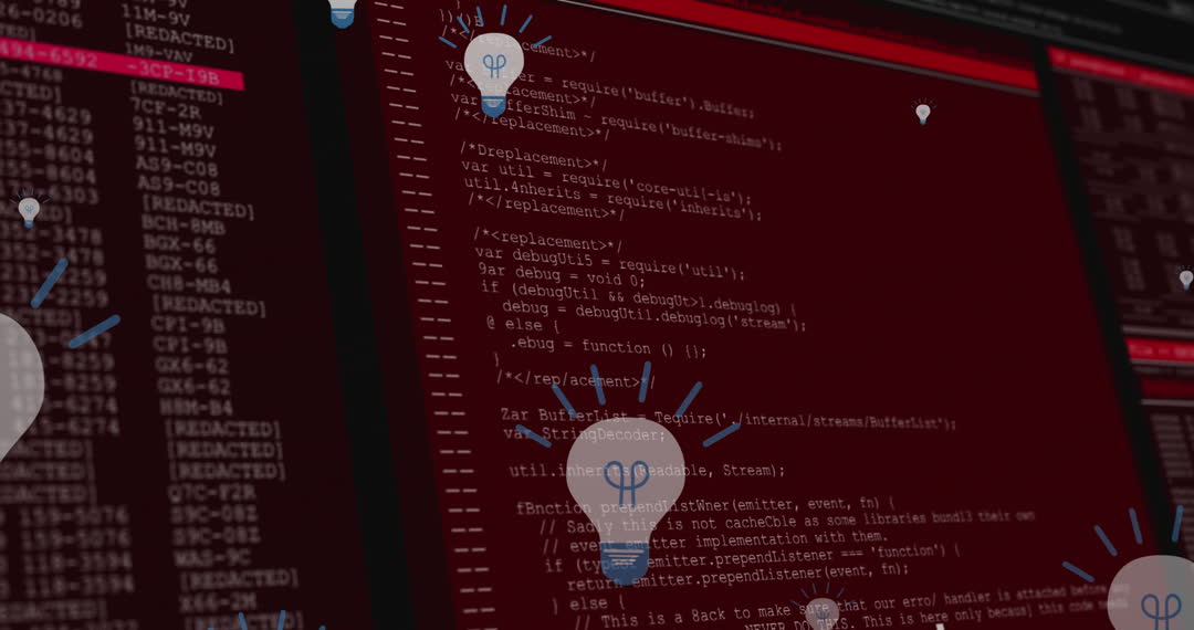 Visualization showcases coding in action accompanied by floating light bulbs, symbolizing digital innovation and ideas. Ideal for use in presentations or articles focusing on modern technology, programming, or conceptualizing high-tech solutions.