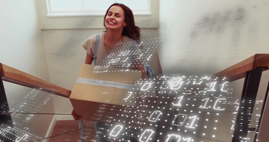 Scene of woman ascending staircase with large box and digital code overlay suggests blend of logistic innovation and renovation during home projects. Useful for illustrating efficiency and progress in home logistics, moving services, or new innovations in delivery technology. Highlights teamwork and simplicity, enhancing lifestyle concepts for marketing or advertisement purposes.