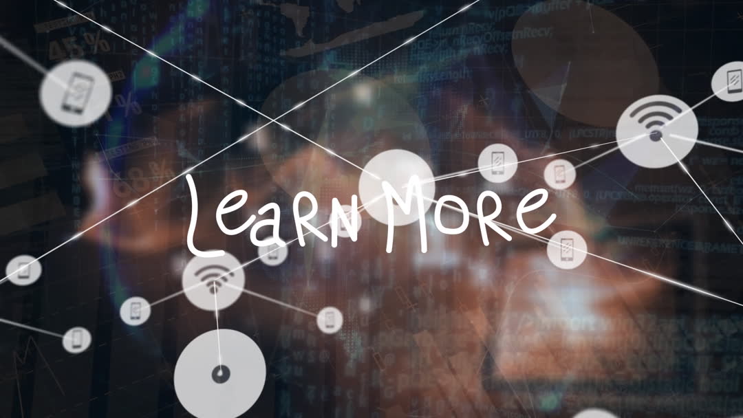 Illustrated digital display showcasing interconnected nodes, symbolizing network connections around the 'Learn More' text. Ideal for themes on technology, global networking, innovation in learning, and digital interface visualizations. Useful for educational, business, and tech industry materials.