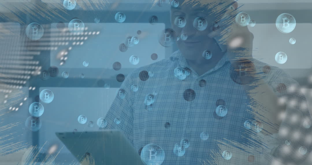 Visual representing modern technology and digital finance innovation through symbolization of bitcoins in motion around a man using tablet. Ideal for illustrating subjects of digital solutions, cryptocurrency, financial technology, and innovative business strategies in promotional and educational materials.