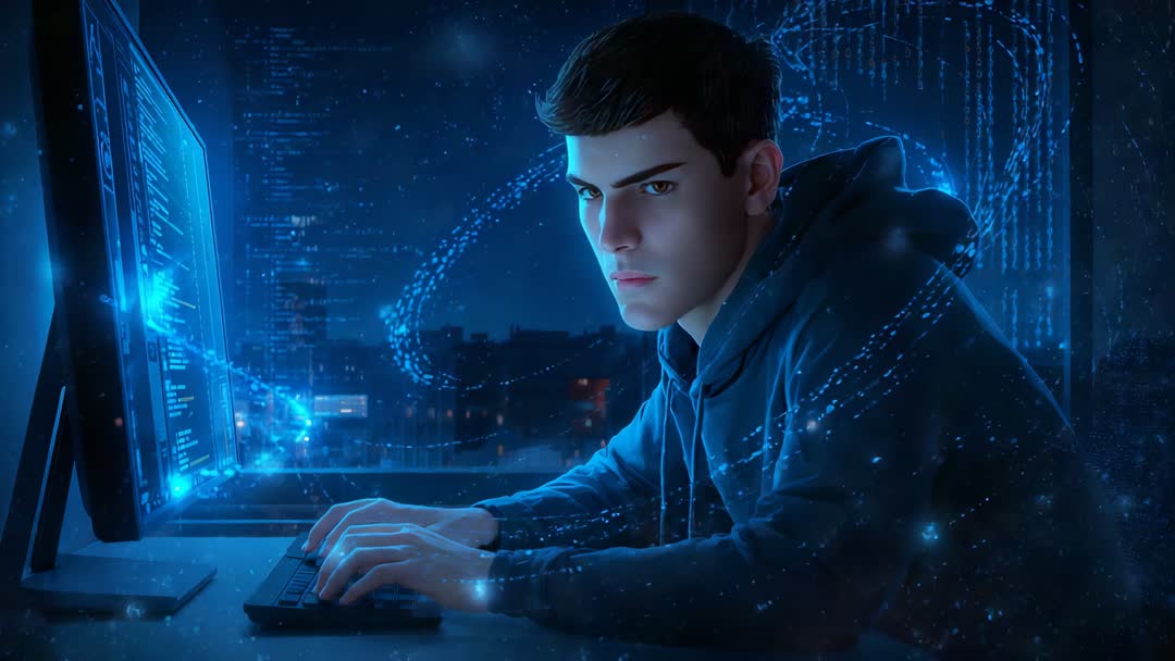 AI Generated Video. A male programmer intensely typing code on a laptop, positioned in a modern high-rise office. Digital data seems to flow around his workstation, highlighting a conceivable focus on cybersecurity or advanced data analysis. Useful for themes related to programming, digital transformation, innovative technologies, and cybersecurity. Ideal for use in articles, blogs, presentations, or advertising pertaining to technology sectors.