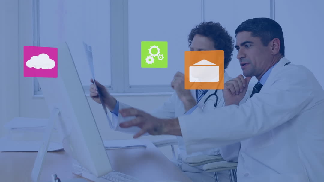 Doctors engage with advanced digital technology, illustrating the modern integration of digital solutions in healthcare settings. Useful for highlighting innovations in medical communication and data processing, promoting healthcare software solutions, and presentations on technological advancements in the medical field.