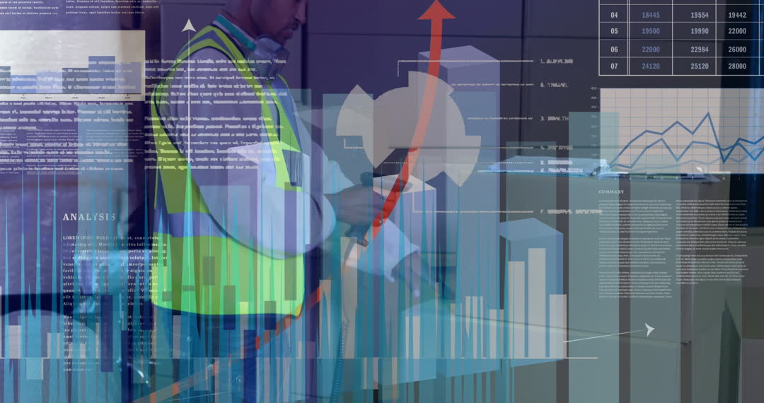 Male warehouse worker interacting with data overlays showcasing statistics and trends. Bright visuals combine various charts and graphs with operational activities. Ideal for illustrating modern logistic solutions, technology integration in workforce management, and data-driven decision-making.
