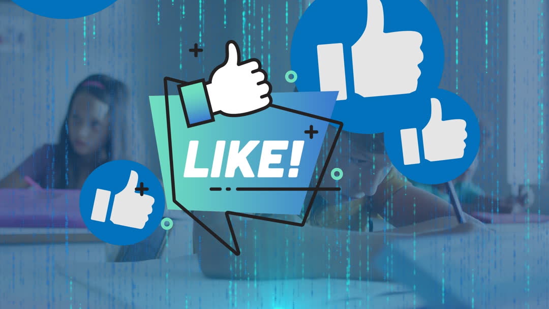 Combination of 'Like' icons and children studying suggests interplay between social media and education. Useful for illustrating technology in learning environments, demonstrating digital influence on education, or conveying social media education topics.