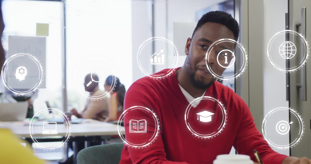 Young African American professional engaging with colleague in a modern tech-forward office. Digital icons represent themes of business strategy, innovation, and information technology. Ideal for showcasing modern office interactions, teamwork, digital innovation themes, and collaborative work environments.