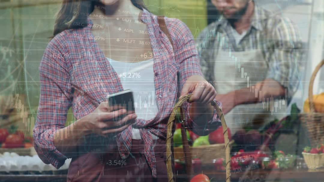 Scene showing digital data overlaying as a woman uses her smartphone in a market. Highlights modern shopping experience and integration of technology in retail. Useful for illustrating trends in mobile commerce, digital payments, and retail innovation in marketing materials or business presentations.