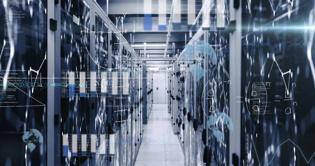 This scene combines a sophisticated server room with abstract data processing and digital interface graphics overlaid. It represents modern technology, data management, and global business operations. Ideal for illustrating themes of advanced IT solutions, cybersecurity, cloud services, or enhanced business capabilities in reports, presentations, or tech-related advertisements.